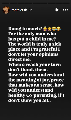 In a move that has left social media users stunned, Nollywood superstar and politician Tonto Dikeh took to her Instagram story today to share an unexpectedly warm message directed at her ex-husband, Olakunle Churchill, in celebration of Mother’s Day.
