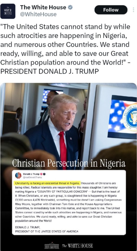 The declaration, shared via a statement on the White House’s official X (formerly Twitter) account, asserted that thousands of Christians are being killed by radical Islamists in Nigeria.